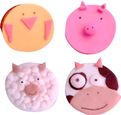 Per a la vaca, el blanc. Col·loquem les taques de fondant negre, i mig cercle de fondant de color carn pel morro. Dibuixem la boca i enganxem els ulls i les orelles.